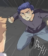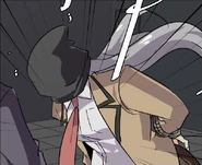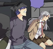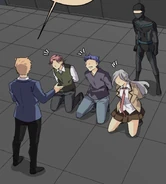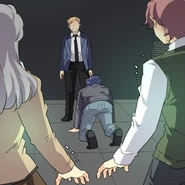 Elsewhere, in an unmarked building, another late-night meeting commences. Three abductees with bags on their heads are forced on their knees. One of them is Rein, Queen of Agwin High School. She struggles to comprehend where she is and why she cannot activate her ability and free herself from some measly ropes. Next to her are two young men she doesn't recognize. And before the three is their host, Orrin. He begins to tell them why he had them brought here, and demonstrates that he knows that each of them went from being the strongest in their respective regions to powerless captives. The purple-haired fellow in the middle speaks out, uninterested in knowing the details of how they all got here. Ignoring the outburst, Orrin offers to give them all their power back in exchange for their assistance. The loudmouth refuses to compromise, and threatens to end Orrin if he doesn't restore his ability. After a moment's pause, Orrin tells the trio that he'll sportingly free them from the bonds they're in, and tells the present agent to untie them. Purple-hair can't believe that the guy freed them. Orrin resumes his proposition, but the angry one prefers to make Orrin pay for all his mistakes. He charges at him and prepares to strike. Nonchalantly, Orrin activates his ability.