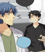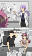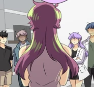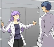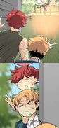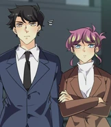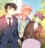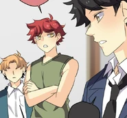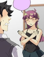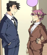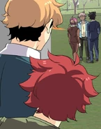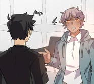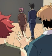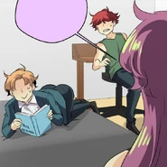 Later at his dorm, John tries dressing up appropriately for the upcoming meeting. His choice of his school uniform is rejected by Seraphina, but it's the nicest outfit he has. So she's forced to look elsewhere. In the adjacent room, her approach is heard by the eavesdropping Isen. He makes a dive for the bed before she opens the door. When Seraphina enters asking Blyke if he has a suit John can borrow, she catches sight of Isen prostrating while holding a trig textbook upside-down. Blyke asks what the occasion is, and Seraphina claims it's for an interview. The pair pretend to buy this excuse. Fortunately for John, he and Blyke wear similar sizes. From outside Blyke's room, Seraphina calls for John to hurry up. He opens the door and all three boys are disarmed by the sight of the Seraphina in a power suit. She thanks Blyke for loaning the suit as she makes a last-minute adjustment to the tie. Blyke simply asks that it be returned to him, because it wasn't cheap. Isen wishes them the best for the "interview" as they head out. He and Blyke then follow them to find out what they're really up to.