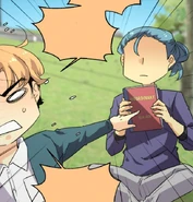 Kuyo then reaches into his bag and tells Remi that he brought something for her. He pulls out a book she recognizes as "Unordinary." Kuyo tells her it was the very copy owned by Rei, and says that she ought to inherit it. Isen blocks him and shoves the book back into his chest, assertively telling him that she won't be taking it. Remi asks what his deal is, and Isen warns her that she was about to accept an infamously cursed book. One peek and she and Blyke were certain to go off risking their lives in some stupid crusade rather than their sound, low-key strategy. Kuyo asks Isen if he really thinks that being a vigilante is stupid. Without hesitating, Isen says yes, because he prefers to live. Remi scoffs and says that Unordinary is just a book. She is also adamant about holding on to one of her brother's keepsakes. Remi swears that she won't read it if Isen's that worried. (Isen feels his attempted rescue is a little underappreciated).