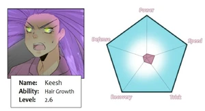She was initially unimpressed with the young vigilante confronting them. But when X-Rei swiftly took out Bimel and Weim, Keesh got serious and used her hair to grab their opponent. She swore she would tear the vigilante apart, but she was quickly zapped unconscious before she got the chance to do so.
